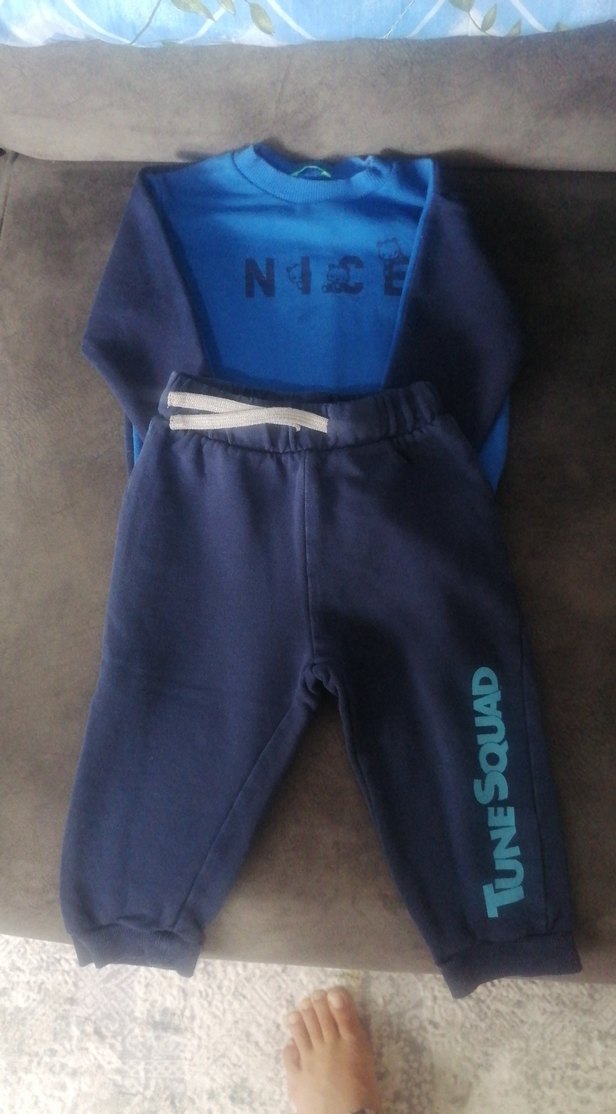 Mavi renkli, "NICE" baskılı uzun kollu sweatshirt ve "TUNE SQUAD" yazılı koyu mavi pantolondan oluşan, yumuşak ve sıcak kumaştan yapılmış erkek bebek takımı. 18 24 ay temizdir