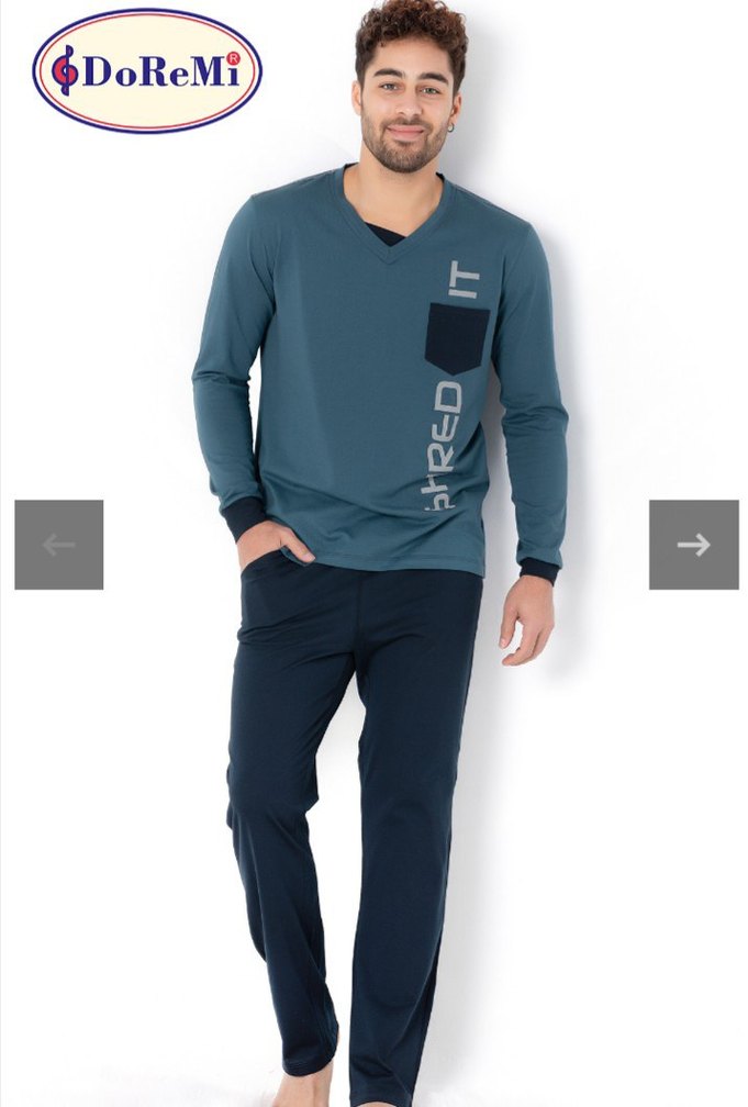 Mavi renkli, uzun kollu ve bisiklet yaka erkek pijama takımı. Üstte cepli ve gri baskılı, alt ise koyu renkli. Rahat kesim ve belden bağlamalı.