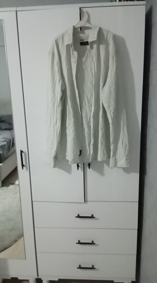 Erkekler için beyaz keten kumaştan, düğmeli ve uzun kollu gömlek. Normal kesim ve notched yakaya sahip, günlük kullanıma uygundur. Minimalist ve sade tarzda.