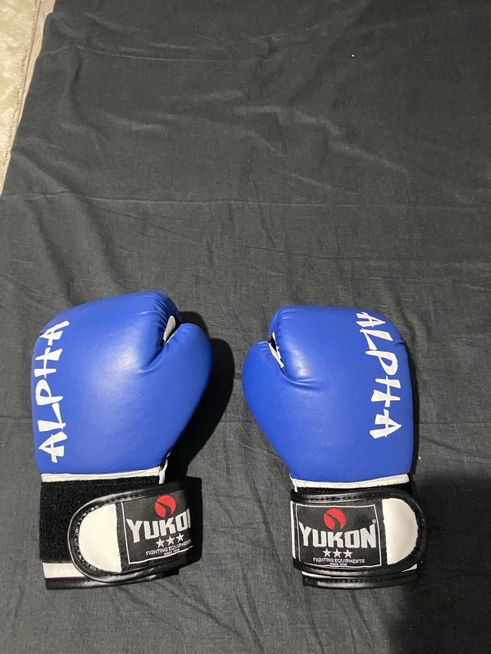 Koyu mavi renkli, baskılı desenli, Velcro bantlı erkek boks eldiveni. Kauçuk malzemeden yapılmıştır ve 'YUKON', 'YUKO' ile 'ALPHA' yazıları bulunur.
