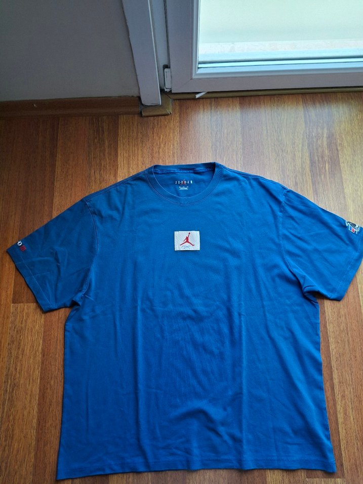 Mavi renkli, pamuklu, kısa kollu erkek tişörtü. Oversize kesim ve yuvarlak yaka ile rahat, sportif ve günlük kullanıma uygun. nike air jordan marka orijinal hic giyilmedi Amerika dan geldi