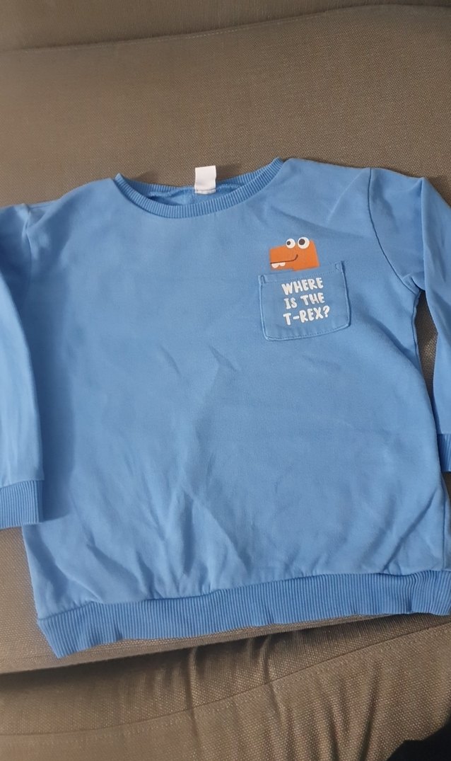 Mavi renkli, uzun kollu ve yuvarlak yakalı erkek çocuk sweatshirtü. Yumuşak ve sıcak kumaştan, cepte "Where is the T-Rex?" baskısı ve fermuar detaylıdır.