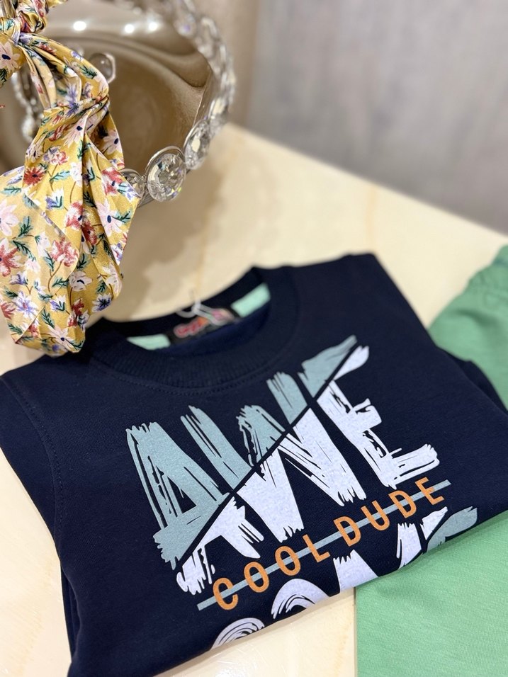 Mavi renkli, pamuklu erkek çocuk sweatshirtü, yuvarlak yakalı, uzun kollu ve bol kesimdir. Baskılı ve 'COOL DUDE' yazılı renkli desen ile süslenmiştir. Fırfır detayları vardır.