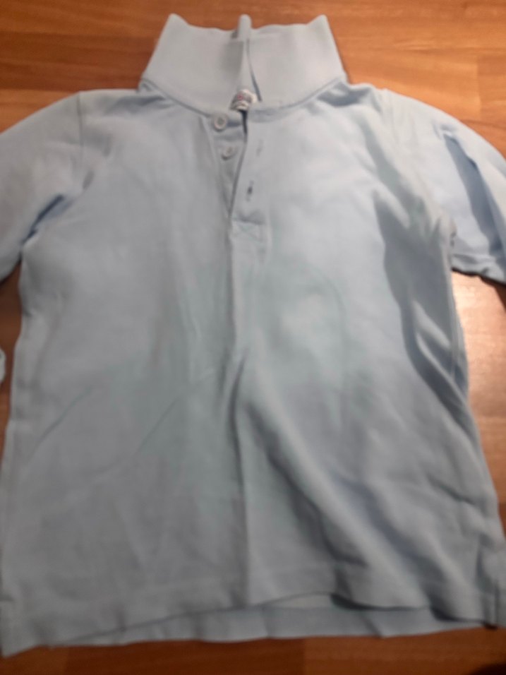 Mavi pastel renkte, pamuk kumaştan yapılmış, düğmeli yakalı Oğlum okul formasına benzediği için giymedi etiketi yok ama hiç kullanılmadı 6 yas