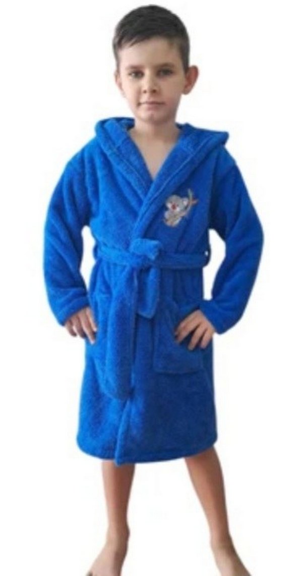 kapüşonlu ve cepli mavi erkek çocuk bornozu. Yumuşak ve emici kumaştan, kemerli tasarıma sahip.