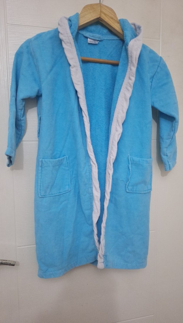 Mavi renkte, pastel bağlamalı desenli erkek çocuk bornozu. Yumuşak dokulu, iki ön cepli rahat tasarım. 11-12 yaş ama ben 7 yaşından itibaren giydirdim ve hala sapasağlam sadece kuşağı mevcut değildir