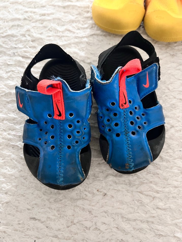 Orijinal Nike marka Mavi renkli, kauçuk malzemeden yapılmış, renkli detaylara sahip ve cırt cırtlı kapamalı erkek çocuk terlikleri. Sokak stiline uygun, desen içermeyen şık bir tasarım. #Nike#ayakkabı