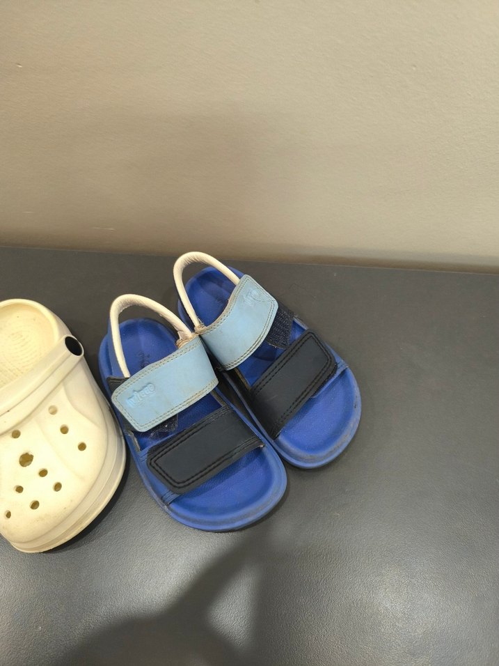 Mavi renkli, cırt cırtlı kayışlara sahip, kauçuk malzemeden yapılmış erkek çocuk terliği. Düz ve sokak stili tasarım.