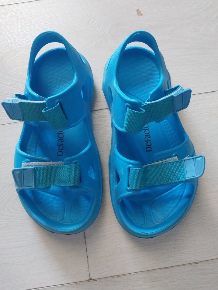 Mavi renkte, dayanaklı kauçuk malzemeden yapılmış, cırt cırtlı kayışlara sahip sade ve rahat erkek çocuk terliği.