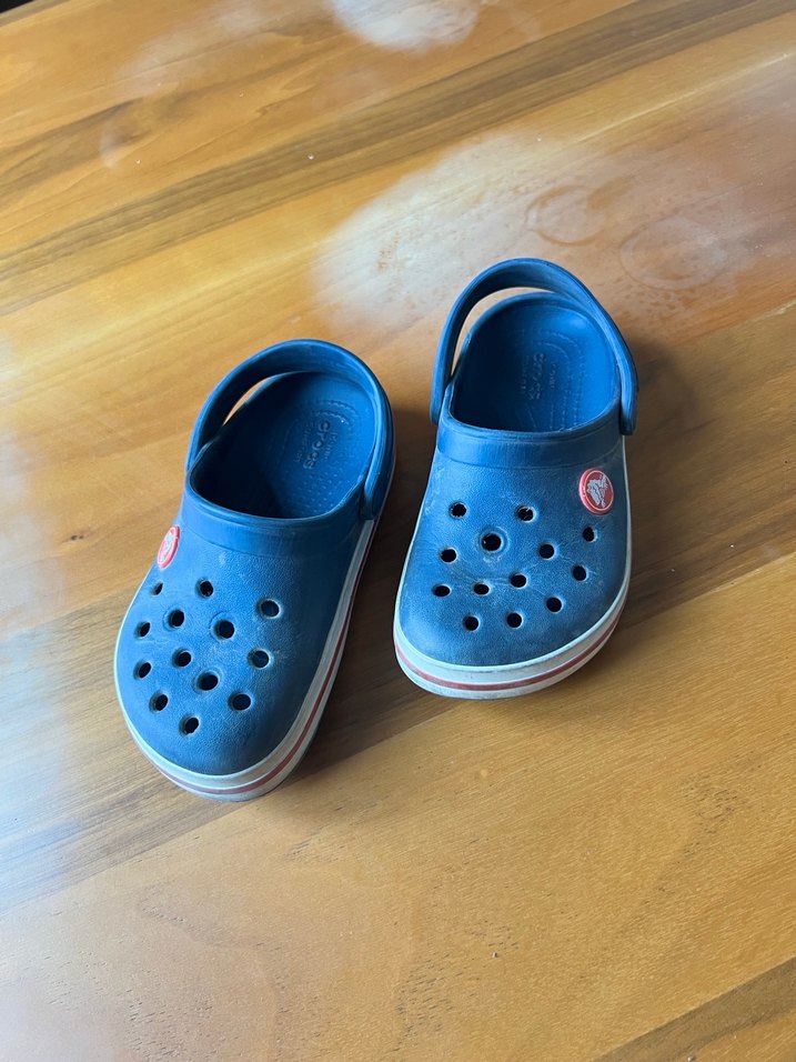 Mavi renkli, cırtcırtlı bantlı ve delikli tabanlı kauçuk erkek çocuk terlikleri. Rahat ve kolay giyilir.