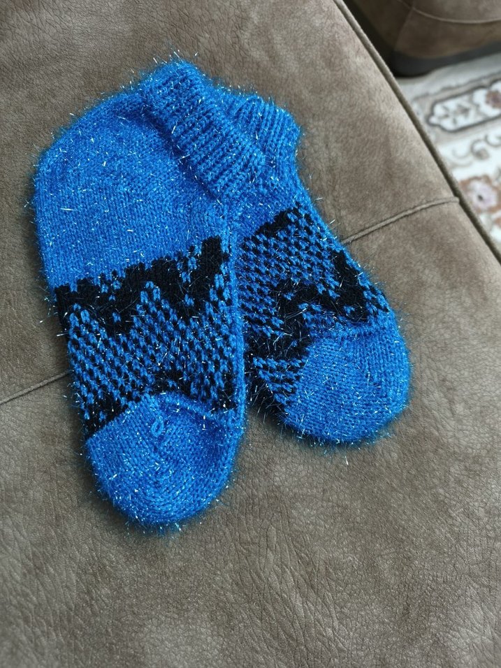 Yumuşak dokulu, siyah zigzag desenli mavi erkek çocuk çorabı. Günlük kullanım için uygun.