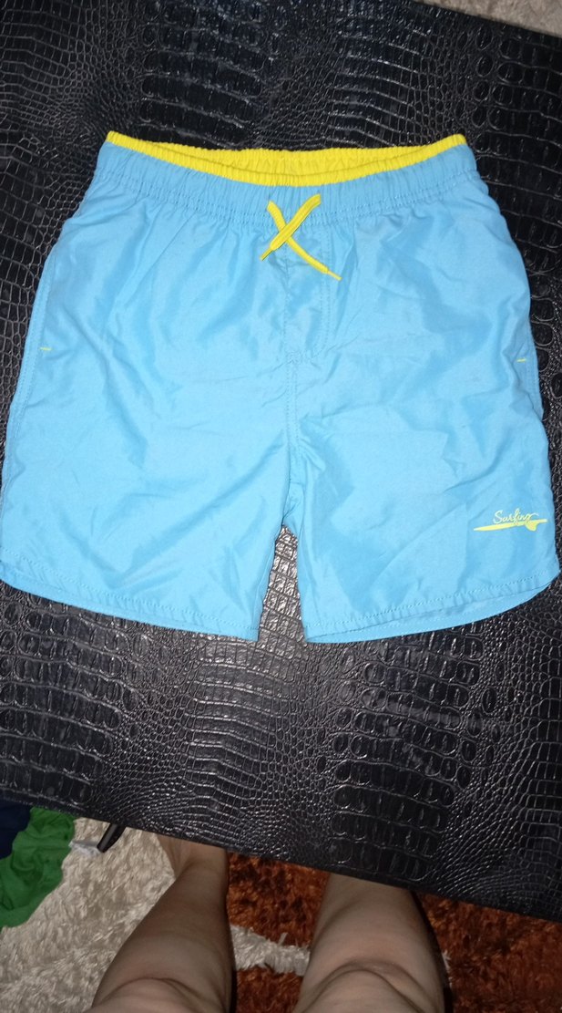 Sarı lastikli ve bağcıklı, hafif kumaştan mavi erkek çocuk deniz şortu. Kolsuz ve desensiz tasarım.