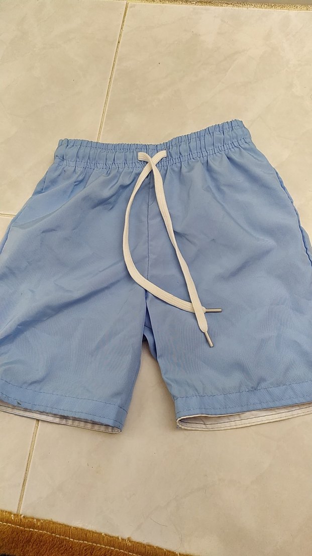 Pastel mavi erkek çocuk deniz şortu, düz desensiz, elastik bel ve beyaz bağcık detaylıdır. Rahat yüzme ve plaj aktiviteleri için uygundur .
