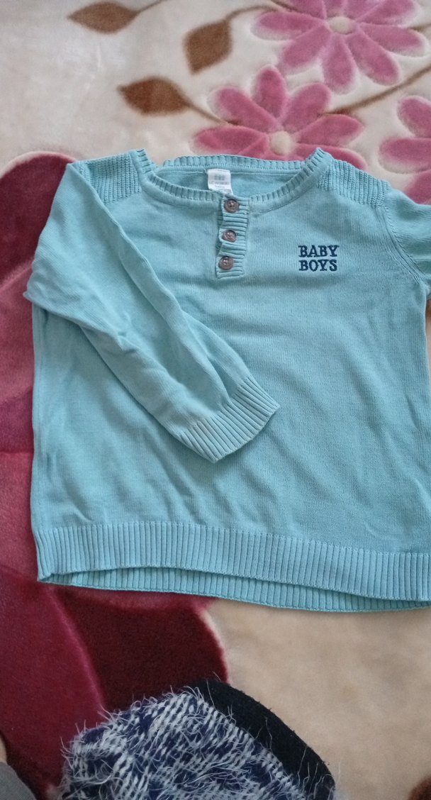 Mavi pastel renkli, düğmeli, triko kumaş erkek çocuk kazak, uzun kollu ve rahat kesimdir. Göğsünde 'BABY BOYS' nakışı bulunur.