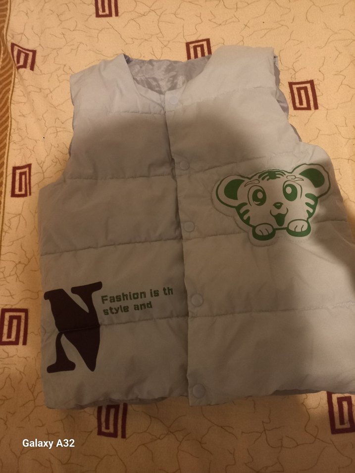 mavi renk, düğmeli, baskılı desenli, yumuşak ve sıcak kumaştan erkek çocuk yeleği. Kolsuz kesim, rahat sokak stili için uygun.