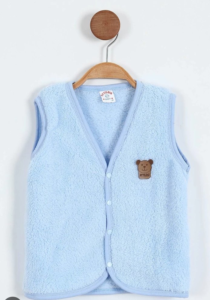 Açık mavi renkte, düğmeli ve V yakalı erkek çocuk yeleği. Yumuşak dokulu, bol kesim ve göğüste nakış ayı detayı bulunur.