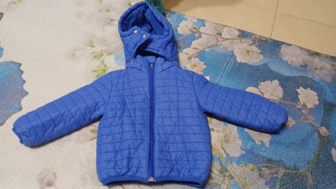 Mavi renkli, fermuarlı ve ince kesim erkek çocuk montu. Yumuşak iç astarlı, parlak dış yüzeyli, günlük sokak stili için uygun.