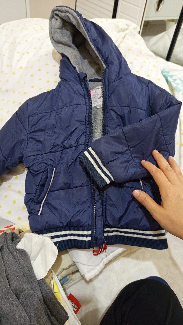 Erkek çocuklar için fermuarlı, oturan kesimli mavi mont. Gri yumuşak iç astar ve kesik yaka detayı bulunur.