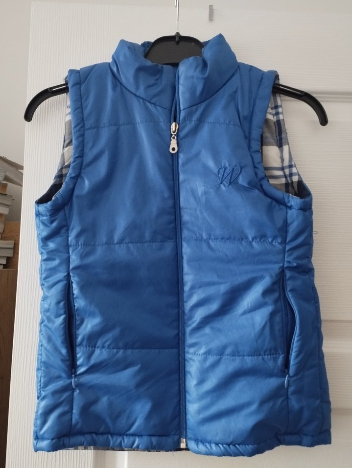 Mavi renkli, fermuarlı cepli ve yüksek yakalı yelek. Yumuşak ve sıcak dokulu kumaştan, dar kesim ve parlak görünümlü. Trendy günlük stil için uygun.