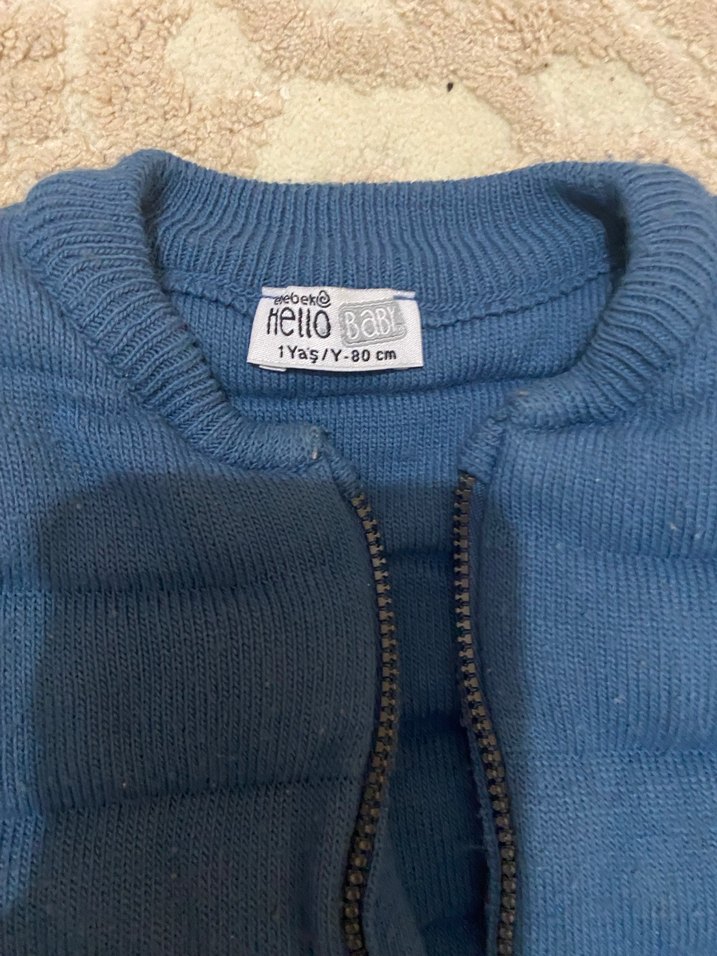 Fermuarlı, uzun kollu ve yün kumaştan üretilmiş mavi-gri tonlarında, 1 yaş erkek çocuklar için normcore tarzda fitted hırka.