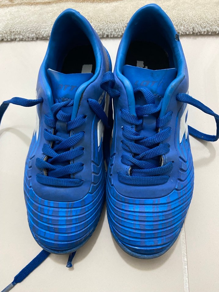 Mavi renkli, kauçuk tabanlı çocuk spor ayakkabısı. Bağcık ve Velcro kapama özellikli, sokak stiline uygun canlı renkte. Sorunu yoktur. Sadece son resimde küçük bir deformesi var.