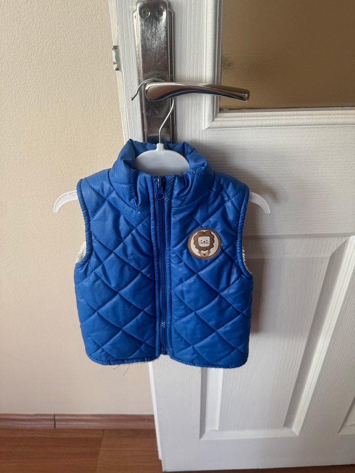 Parlak mavi kapitone erkek çocuk yeleği, boğazlı ve tokalı detaylıdır. Sıcak tutan yumuşak kumaştan üretilmiştir.