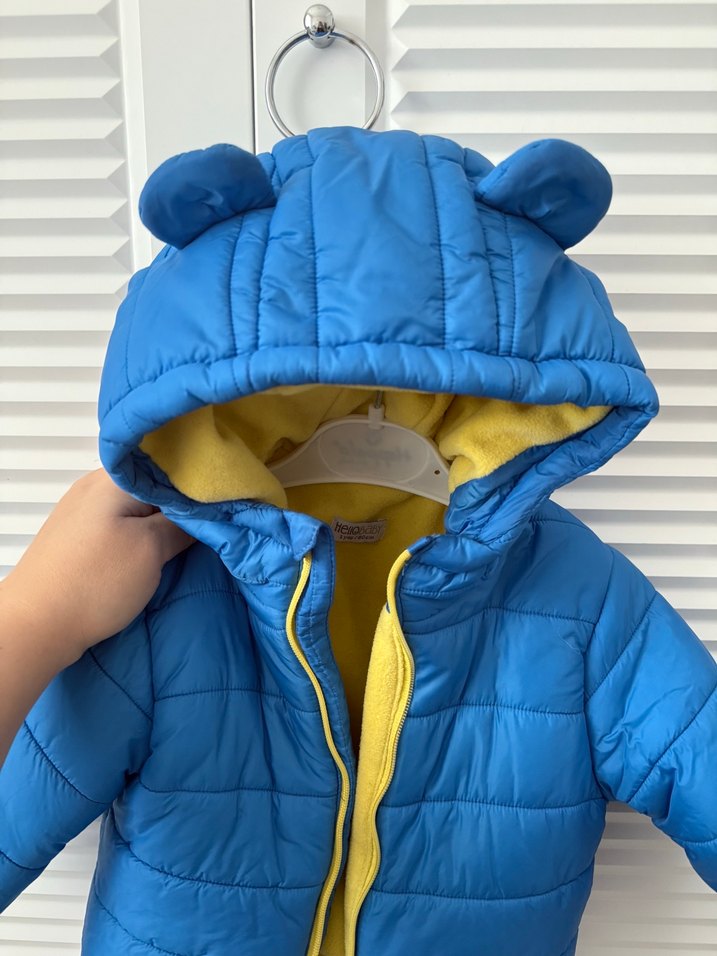 Erkek çocuklar için mavi, fitted kesim mont, fermuarlı ve yakası notched lapel tarzında. Yumuşak, sıcak astarlı ve kulaklı kapüşonlu, street wear için uygun.