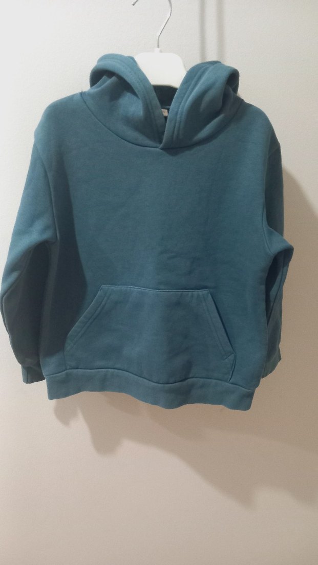 Erkek çocuk için mavi, kapüşonlu sweatshirt. Uzun kollu, bol kesim ve yumuşak, sıcak kumaşlıdır. Ön cep içerir, sade ve sokak stiline uygun.