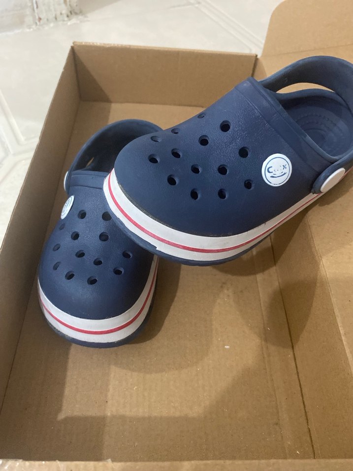 Koyu mavi renkli, baskılı detaylara sahip kauçuk erkek çocuk terlikleri, cırt cırtlı bantla sabitlenir, sokak stiline uygun. 27 numara tabanı 17 cm