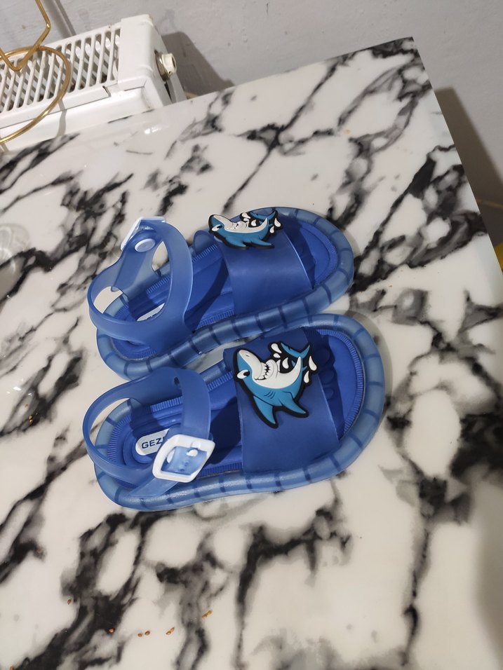 Mavi renkli, kaydırmaz tabanlı, köpekbalığı desenli, bantlı çocuk sandaletleri, günlük kullanıma uygun.yeni alındı ama olmadı ayağına öylece duruyor 500 alındı