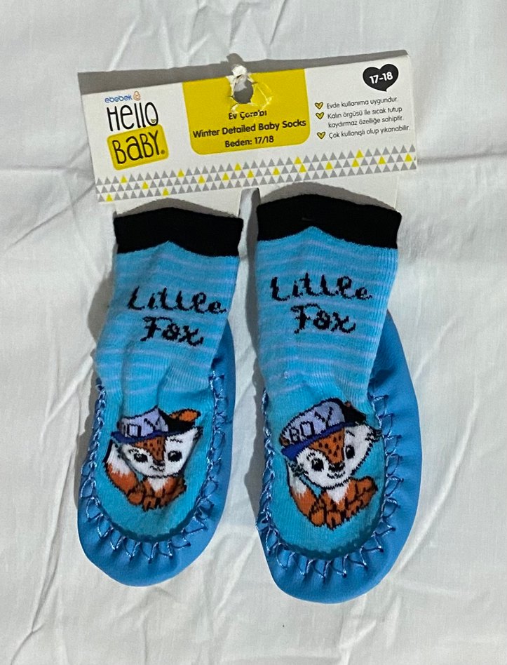 Mavi renkli, baskılı tilki desenli erkek çocuk kaydırmaz çorap. 17-18 beden, evde kullanım için uygundur. Ürün kullanılmamıştır. Değişim ve iade yoktur.