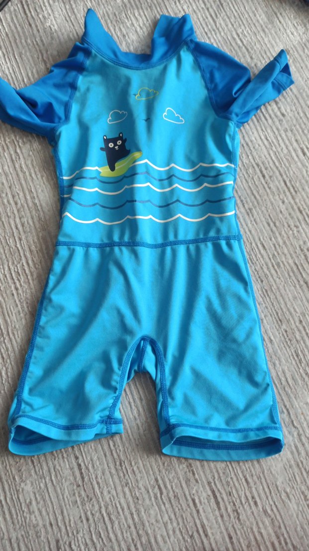 Kısa kollu, canlı mavi renkli erkek çocuk mayo. Önünde dalgalar, bulutlar ve sevimli kedi figürü bulunur. Hızlı kuruyan, yumuşak kumaştan yapılmıştır.