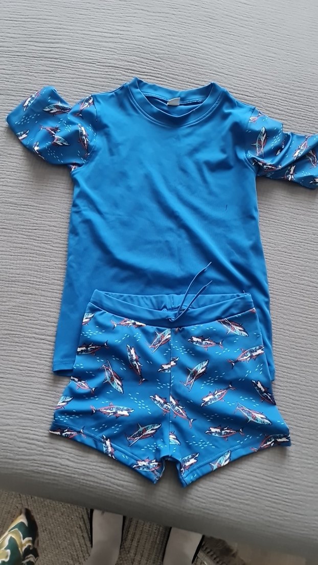 Kısa kollu mavi üst ve köpek balığı desenli şortlardan oluşan, hızlı kuruyan kumaştan erkek çocuk mayo takımı.