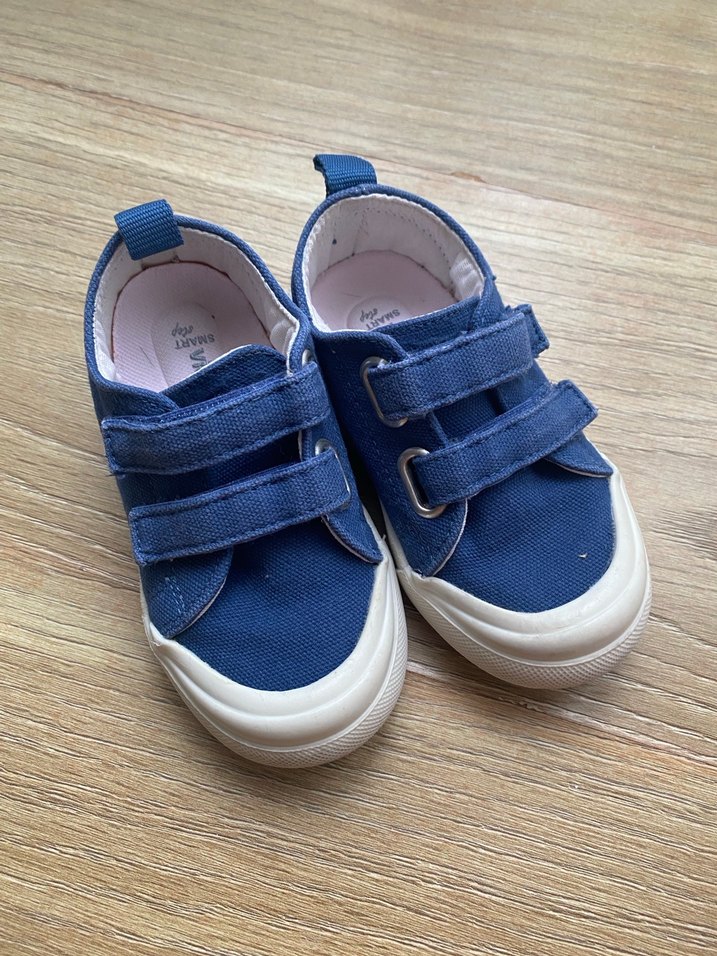 Mavi kot kumaştan, bantlı erkek çocuk spor ayakkabı. Rahat ve kolay giyilen, sokak stiline uygun bir model.