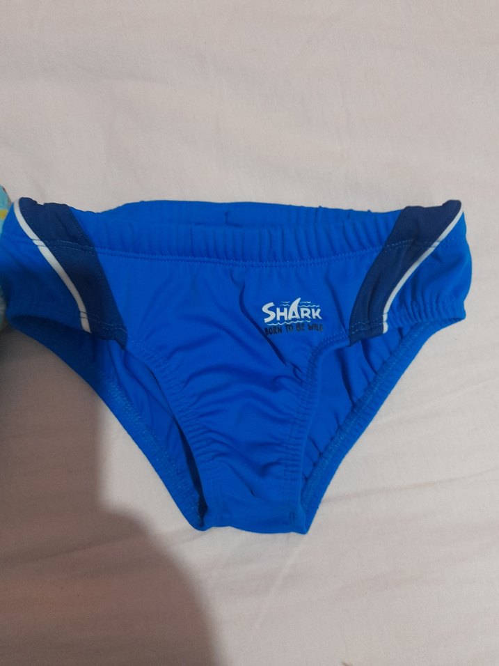 Mavi renkli, askılı erkek çocuk mayo. Önünde "SHARK" yazısı bulunmaktadır.