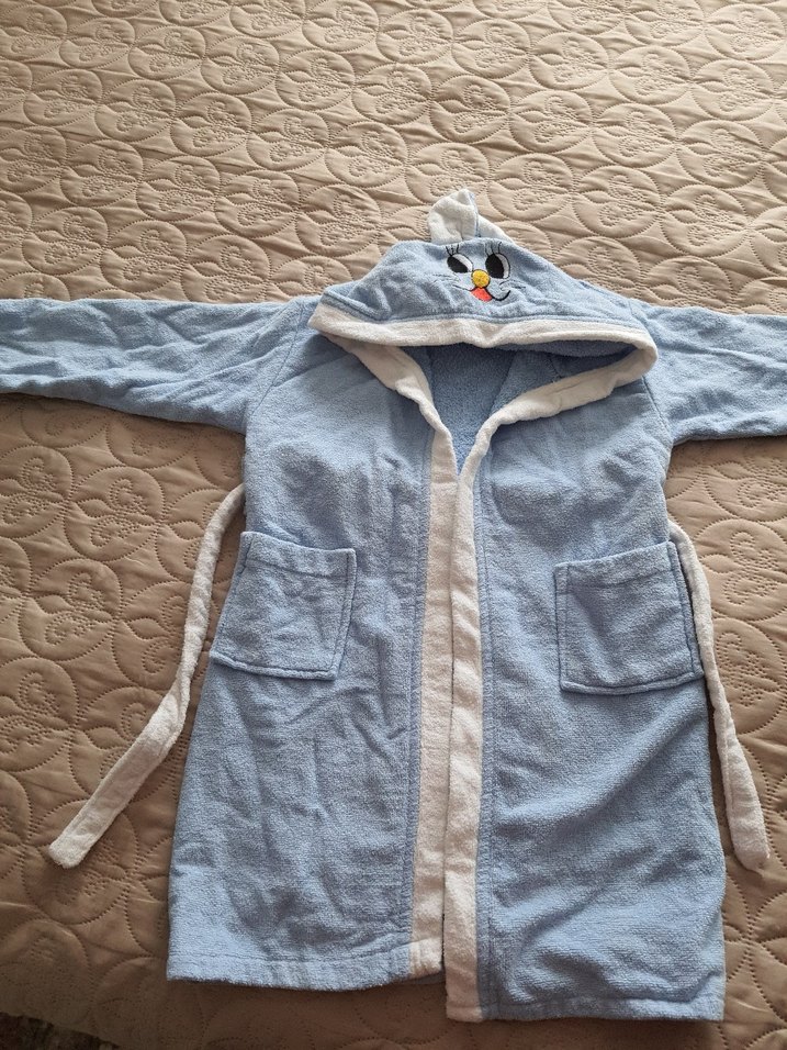 Nakışlı detaylara sahip mavi erkek çocuk bornozu, kapüşonlu ve eğlenceli yüz desenlidir. İki cep ve bağlama kemeri vardır, yumuşak ve emici kumaştan yapılmıştır.