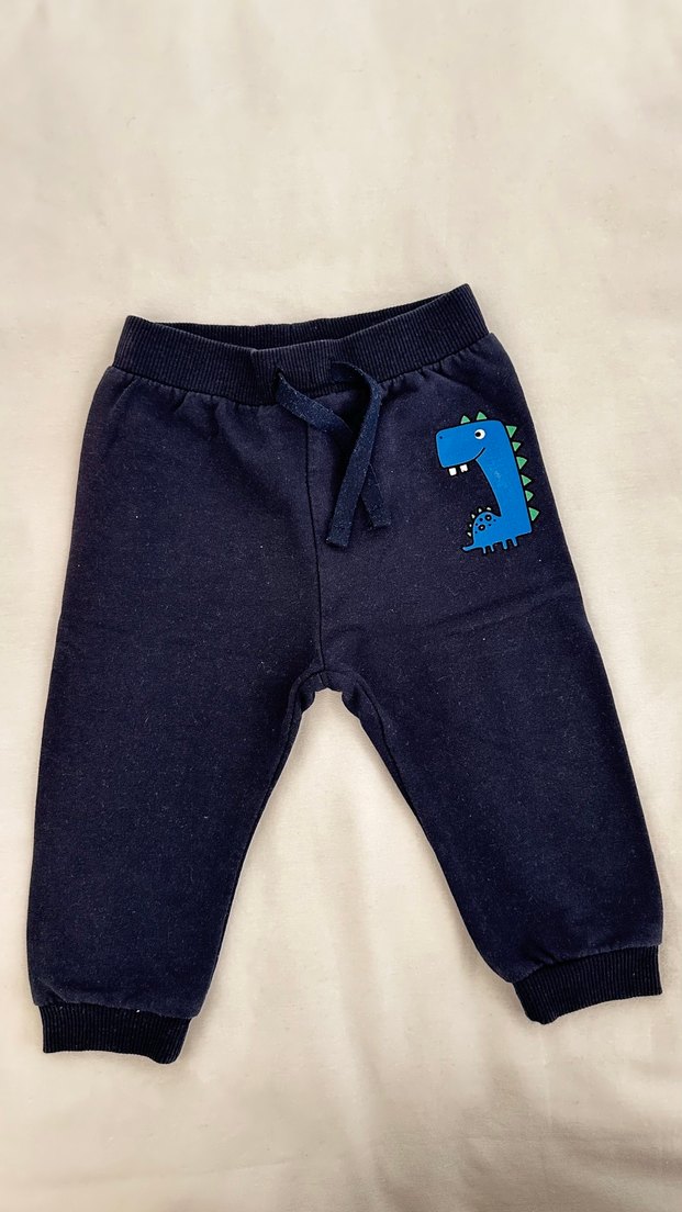 Mavi renkli, yumuşak ve sıcak kumaştan yapılmış, nakışlı dinozor deseni bulunan erkek çocuk eşofman altı. Cırt cırtlı kapanış ve ribana paçalar içerir.