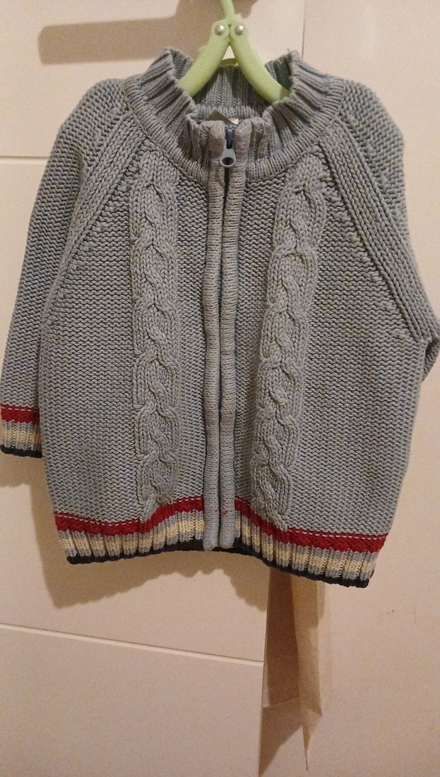 Mavi renkli, uzun kollu, örgü erkek çocuk hırkası, işlemeli detaylara sahip, manşet ve etek kısmında kırmızı ve krem renk şeritler bulunur.