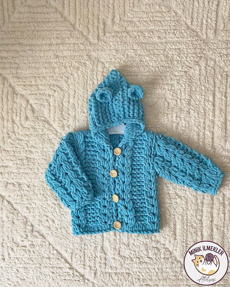 Minik ilmekler markalı, Mavi renkli, kulaklı kapüşonlu, uzun kollu ve fitted kesim örgü erkek çocuk hırkası. Ahşap düğmeli, renkli ve yumuşak dokulu.