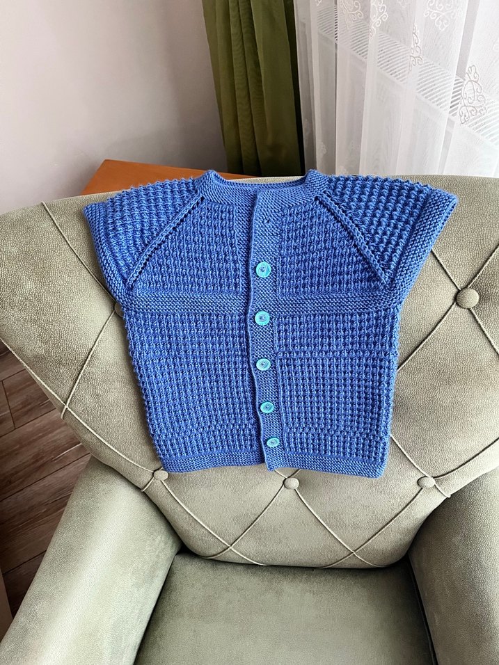 Mavi renkli, kolsuz ve fitted kesim erkek çocuk örgü hırka. Düğmeli ön kısmı ve dokulu örgü deseni ile normcore tarzında. El yapımıdır. Rengi ışık dolayısıyla soluk çıktı daha canlı bir mavi rengine sahip. .Fiyat telkif edebilirsiniz.