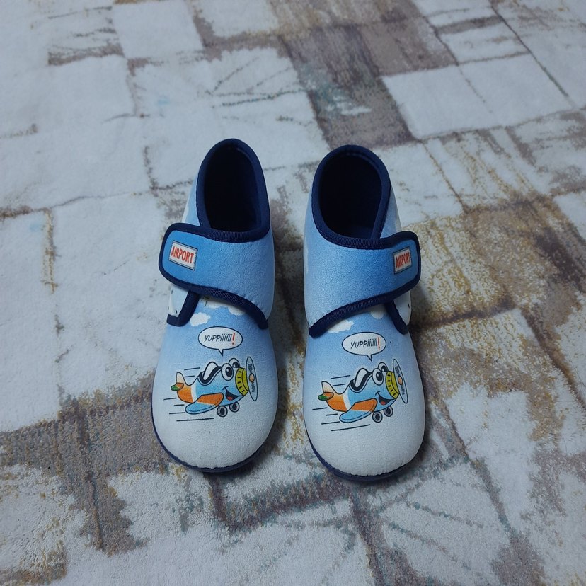 Mavi renkli, renkli uçak baskılı, cırt cırt bantlı erkek çocuk panduf. Yumuşak ve rahat, yeni gibi.