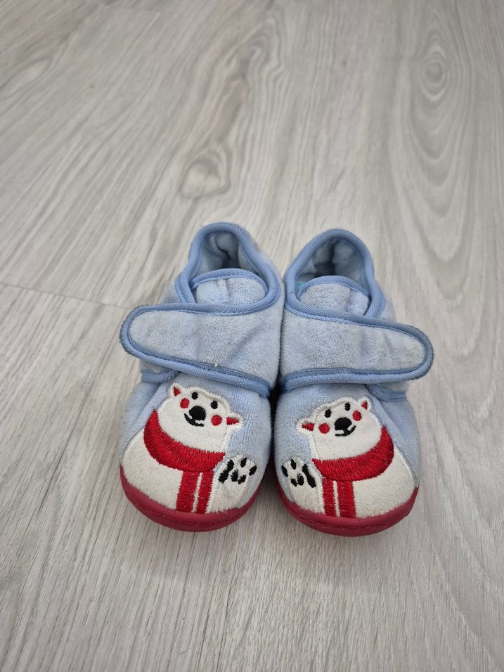 Yumuşak kumaştan yapılmış, renkli nakışlı ayı desenli ve cırt cırtlı mavi erkek çocuk ev terliği. sıfır gibi çok temiz