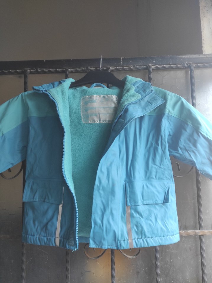 Mavi renkli erkek çocuk yağmurluğu, yumuşak polar astarlı ve parlak görünümlüdür. Geniş kesim, kesik yaka ve cırt cırtlı kapanışa sahiptir. ️