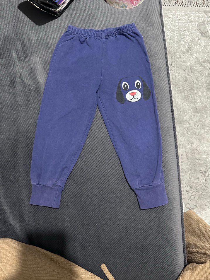 Yumuşak ve sıcak kumaştan yapılmış, rahat kesimli mavi erkek çocuk eşofman altı. Sevimli köpek baskısı ve elastik bel bandı bulunur.