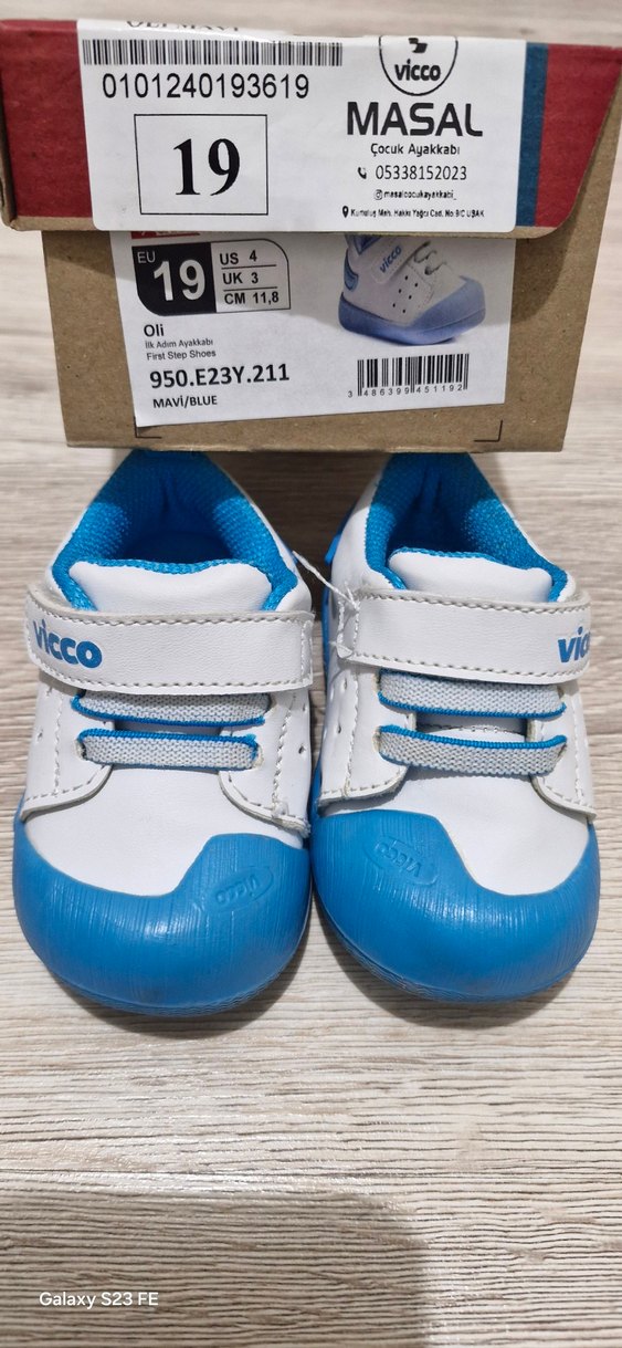 Mavi ve beyaz renkli, baskılı desenli, kauçuk tabanlı, Velcro bantlı erkek çocuk sneakers ayakkabı. UK 3, US 4, EU 19 beden. İlk yürüme ayakkabısıdır. Fakat bebeğim yürümeden önce kullandı ayak numarası büyüdüğü için hiç yere basmadan başka ayakkabıya geçtik. Çok iyi durumdadır.