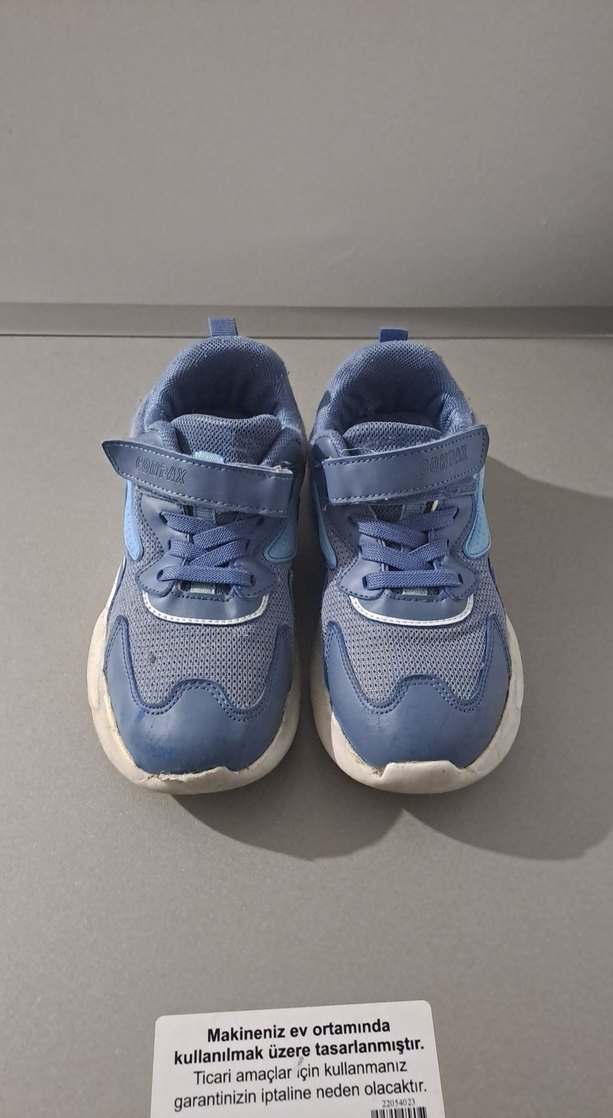 Mavi erkek çocuk spor ayakkabısı, cırt cırtlı ve kauçuk tabanlıdır. Gri detaylı, desen içermeyen sade bir sokak stili tasarımı vardır.