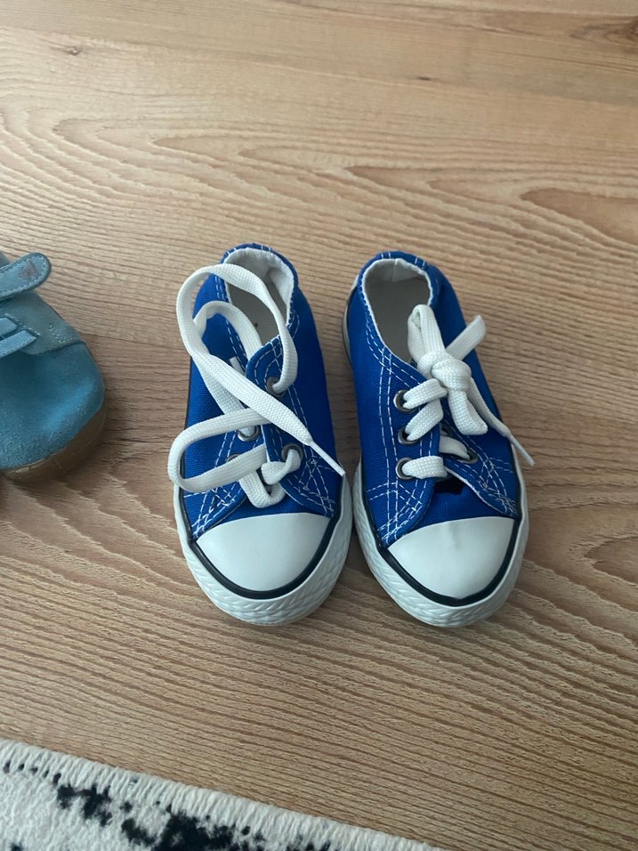 Mavi renkli, kauçuk tabanlı erkek çocuk spor ayakkabısı. Beyaz bağcık ve kolay açılıp kapanan sade ve renkli tasarım. Numarası yok ama 22 numaraya rahatlıkla olur
