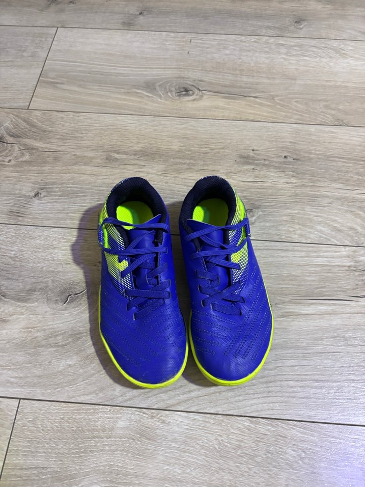 Mavi renkli, renkli detaylara sahip, velcro bantlı ve kauçuk malzemeden üretilmiş erkek çocuk spor krampon ayakkabısı. ♂️