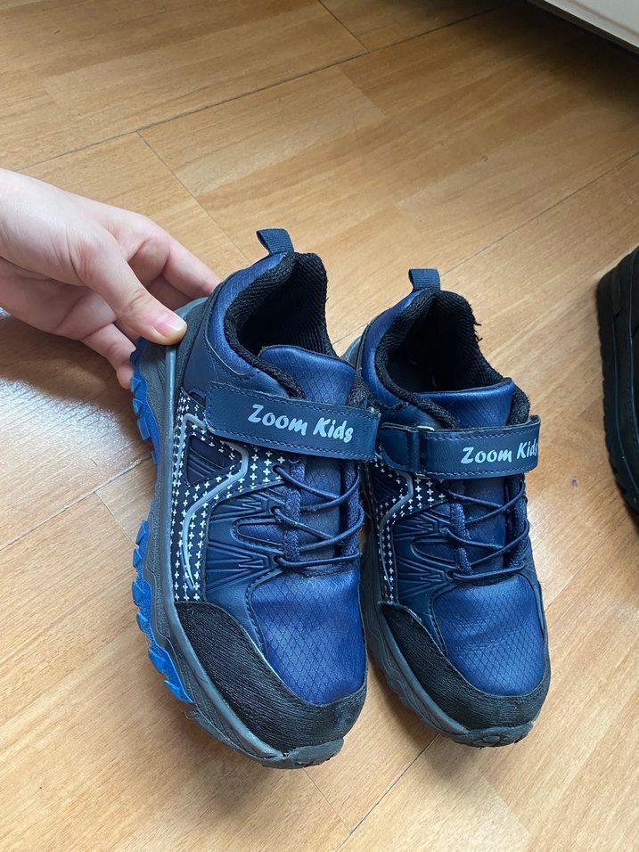 Koyu mavi baskılı ve Velcro bantlı erkek çocuk spor ayakkabısı, kauçuk tabanlı, şehir stili için uygundur. Marka: Zoom Kids.