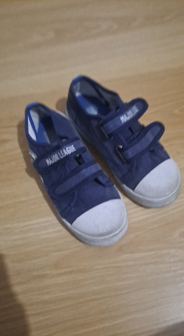 Mavi erkek çocuk spor ayakkabısı, velcro bantlı ve kauçuk tabanlıdır. Gri burun kısmı ve bantlarda "MAJOR LEAGUE" yazısı vardır. ⚾